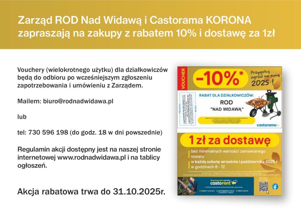 W celu wsparcia naszych działkowiczów, zawarliśmy współpracę z Castoramą (Wrocław Korona), dzięki czemu uzyskaliśmy dla Państwa 10% zniżki na zakupy w tym sklepie. Każda działka ma prawo do jednego kuponu. Szczegóły akcji promocyjnej znajdą Państwo w załączonym regulaminie. W celu odbioru kuponów prosimy o kontakt telefoniczny (tel. 730 596 198) lub mailowy (biuro@rodnadwidawa.pl). Kupony są ważne do 30.06.2024 r.